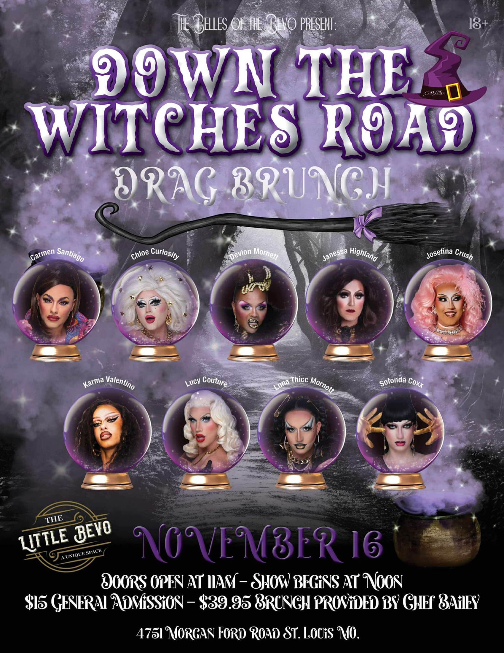 Double, double, toil, and trouble… brunch is about to get bewitching! Join us as we journey Down the Witches Road for a spellbinding drag brunch filled with glamour, magic, and mischief. Step into a world where enchantment reigns, glitter glows like moonlight, and the sassiest witches are ready to cast their charm.